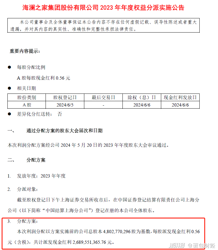 海瀾之家2023年年度權益分派實施公告顯示,公司2023 年年度分配方案為:以方案實施前的公司總股本4,802,770,296股為基數(shù),每股派發(fā)現(xiàn)金紅利0.56 元(含稅),共計派發(fā)現(xiàn)金紅利 2,689,551,365.76 元。
