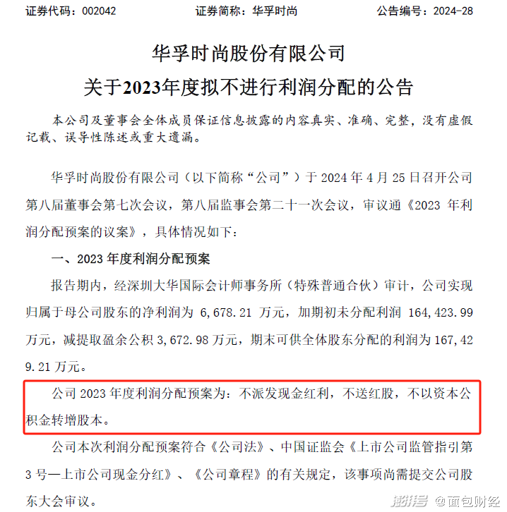 華孚時尚關于2023年度擬不進行利潤分配的公告顯示,公司2023年度利潤分配預案為:不派發(fā)現(xiàn)金紅利,不送紅股,不以資本公積金轉增股本。