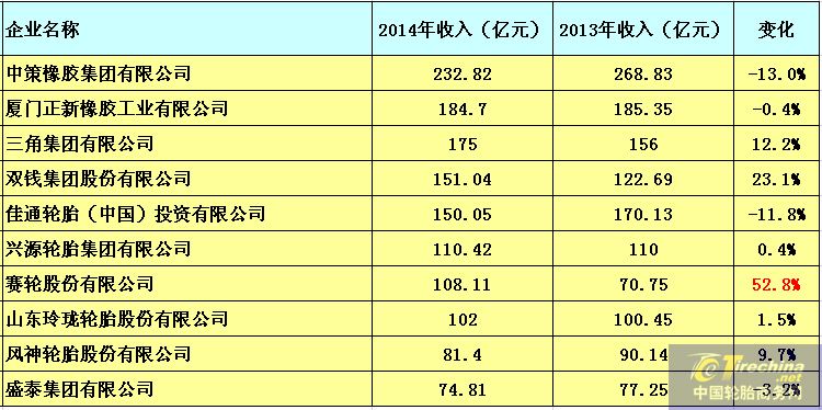 中國(guó)輪胎企業(yè)風(fēng)起云涌,花開(kāi)花落隨著2014年雖然已經(jīng)落下帷幕,我們回頭看看中國(guó)輪胎企業(yè)的脊梁們過(guò)往的一年中收入幾何,數(shù)字是指運(yùn)營(yíng)收入并不是利潤(rùn)。